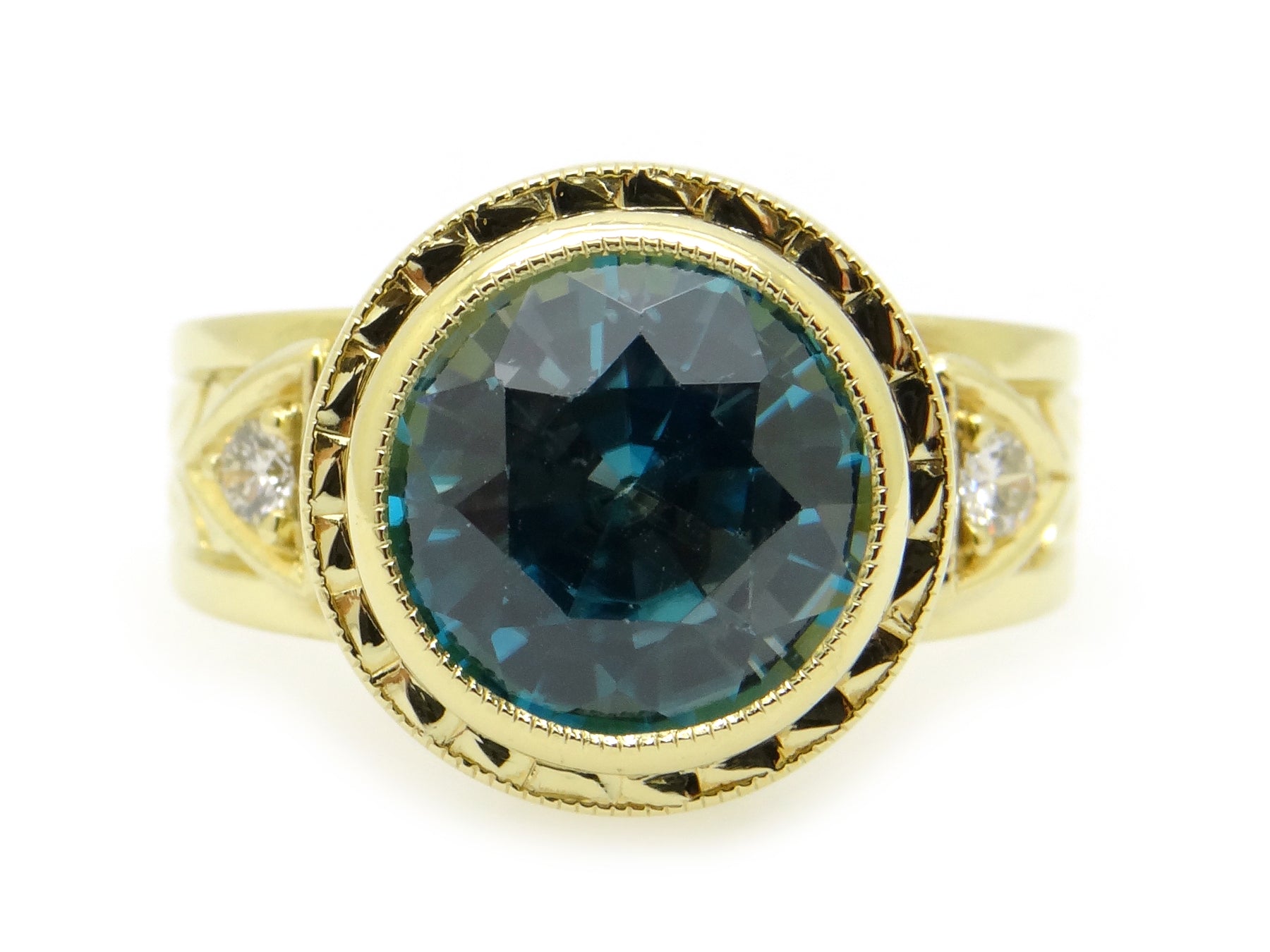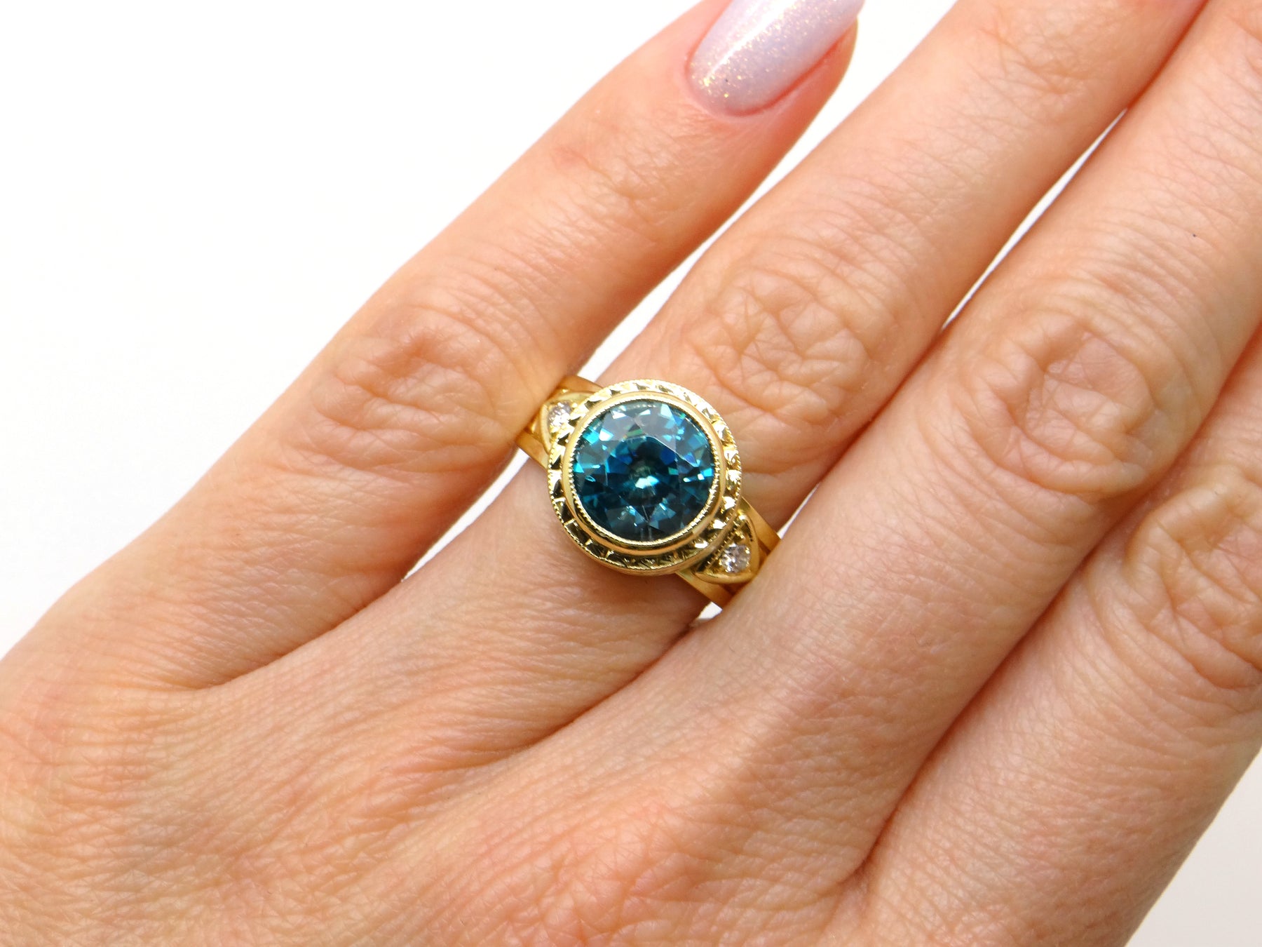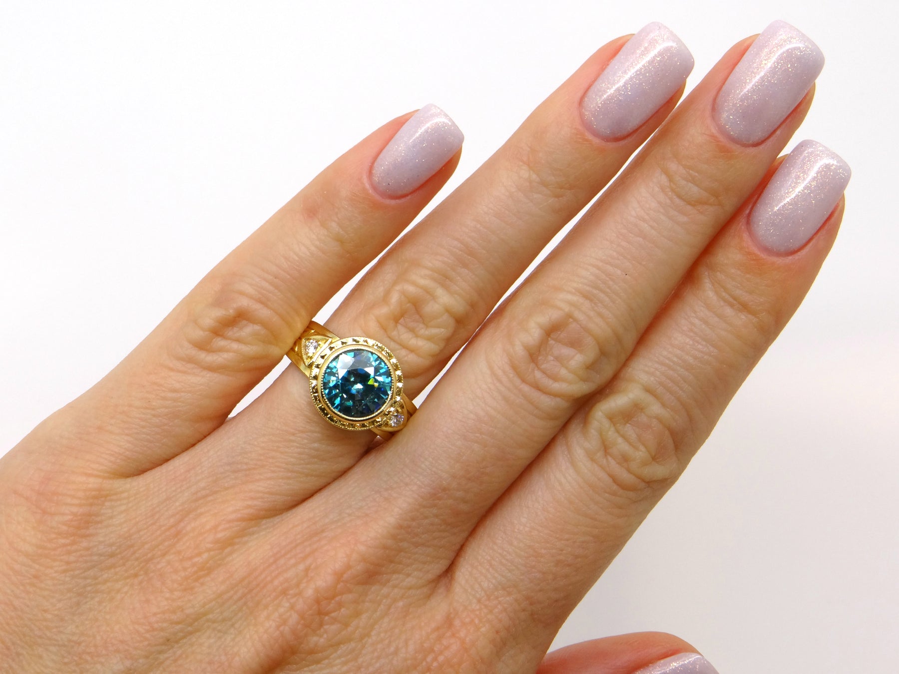 Center Stone: Round Brilliant Cut Blue Zircon