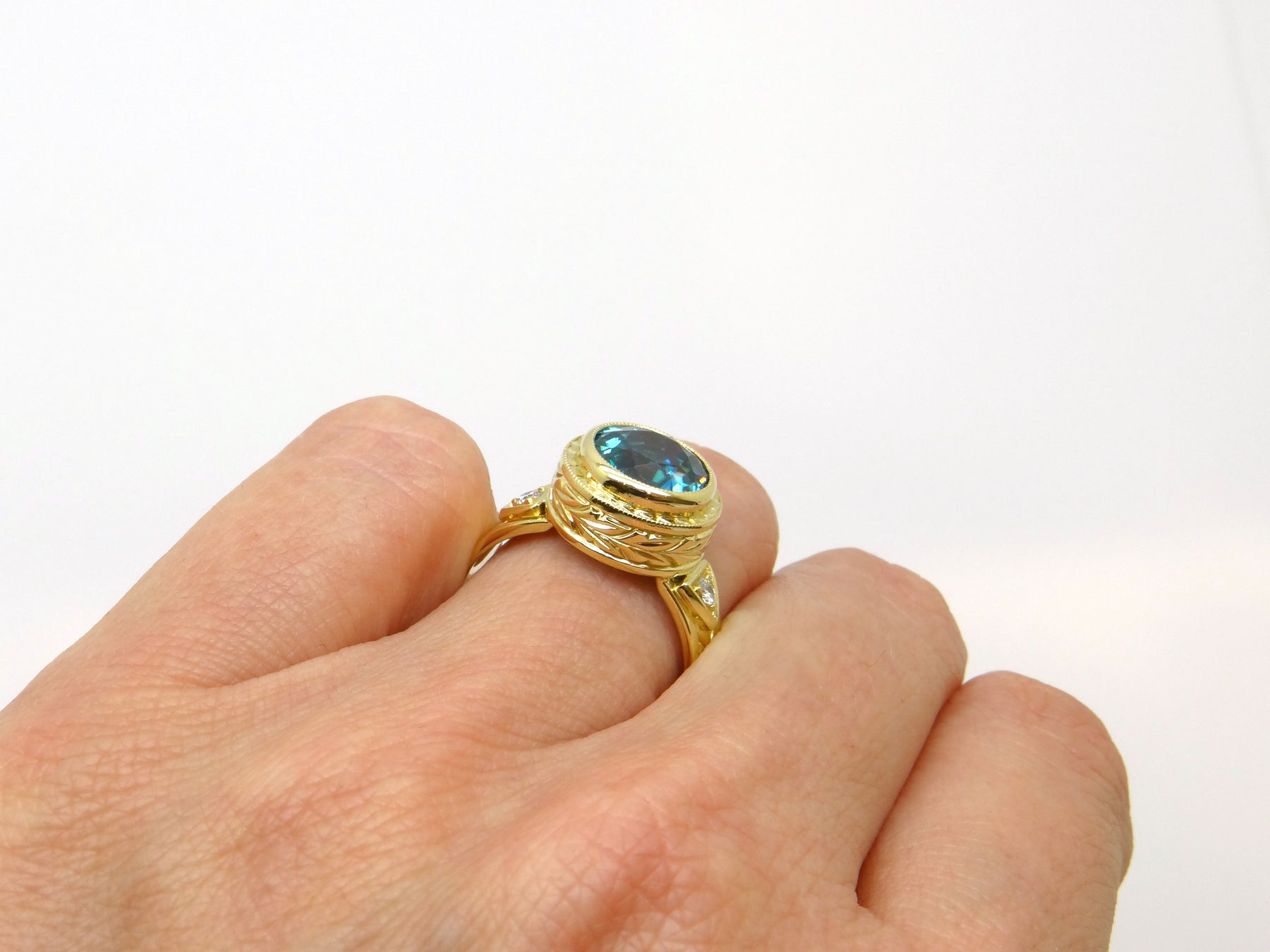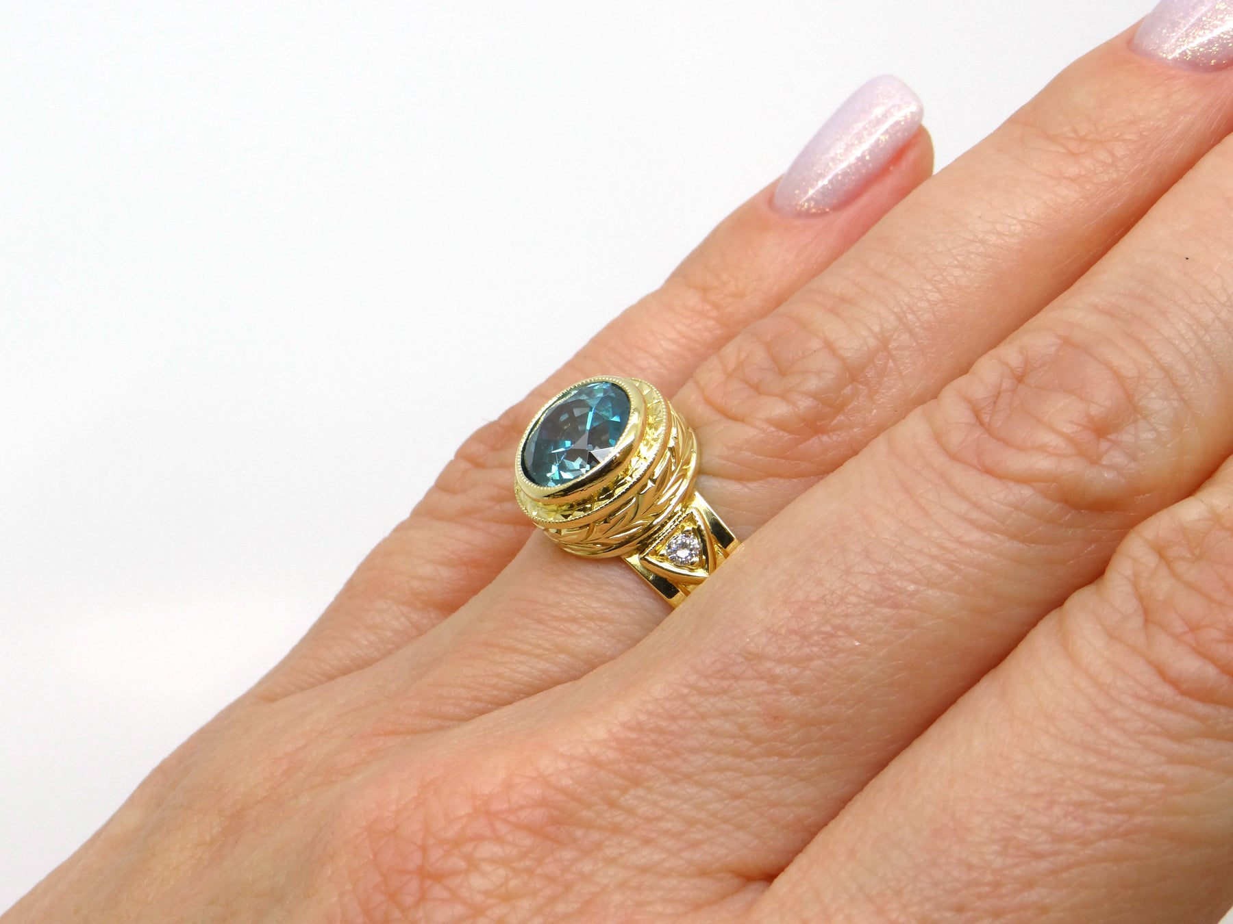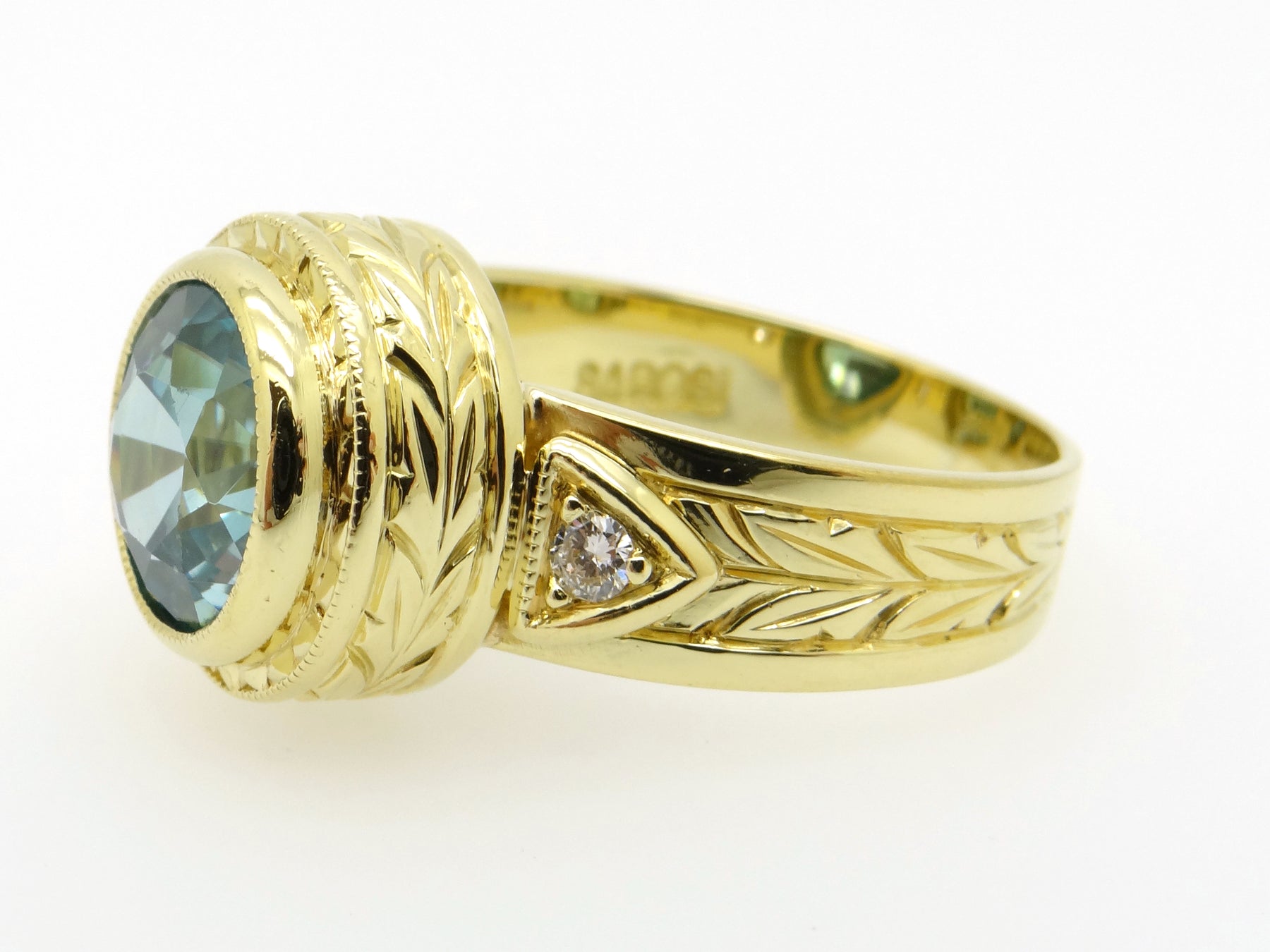 Center Stone: Round Brilliant Cut Blue Zircon